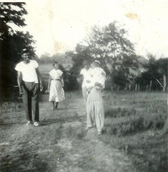 Back in the days when family came back "home" for a visit, the men folks always helped in the fields. The women in the family always help around the house. Now there were some female family members who also went out into the fields. I can remember my grandmother Edith Wooten (wife of George Wooten) would always have my sister, Fannie and I clean the food pantry.I dont know who all is pictured or the year the photo was taked, but I do know that on the far right is Lee Ester Black two sons, James and Lawerence. And "Papa" George Wooten" is right there in the front.